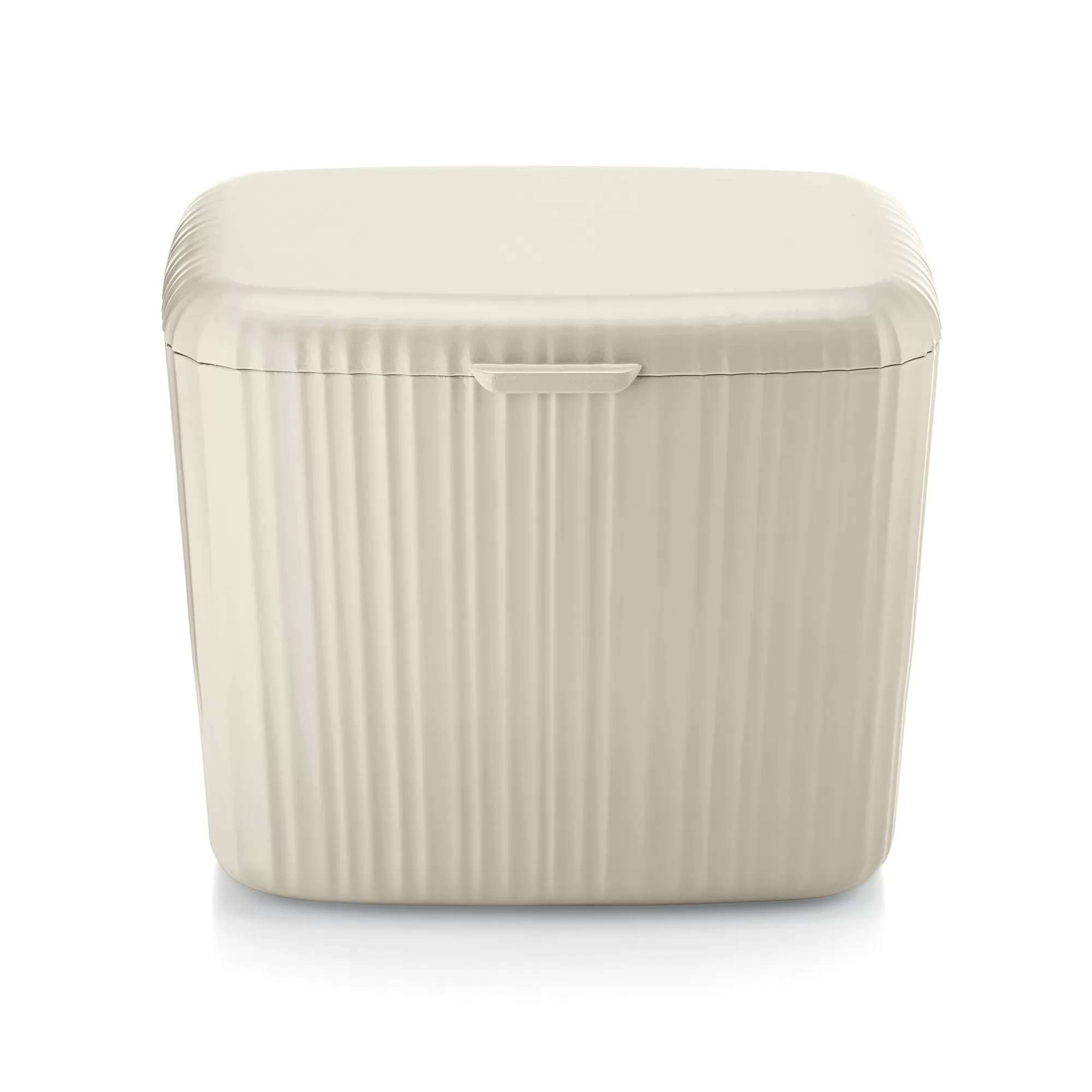 Food waste caddy, a container with lid to collect the organic and compostable waste produced during cooking, made from antibacterial plastic which reduces bacteria proliferation, by recycling 4.6 100% post-consumer disposable plastic detergent bottles.