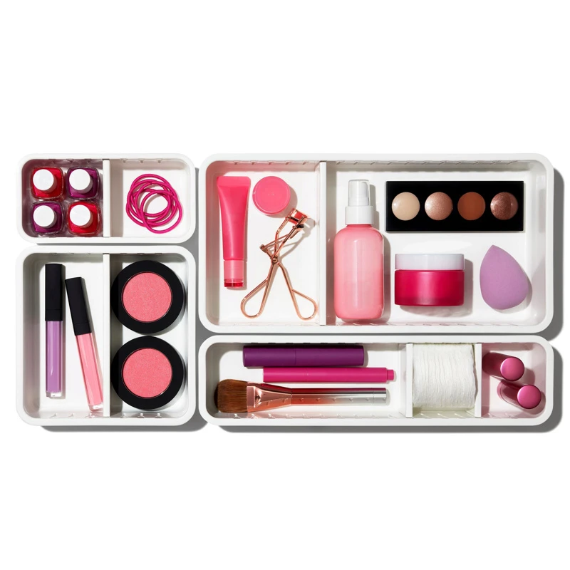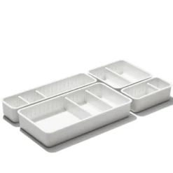 - Designed with movable dividers that slide and snap into channels to separate items for space-efficient organization in cabinets or drawers.