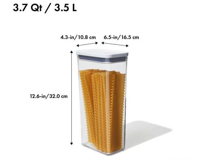 Rectangle Tall Container, 3.5L. Ideal size for boxed cereal, lasagna and more. Get an airtight seal with the press of a button. Accessories attachment on base of each lid allows to store scoops, levelers and more. Containers are stackable for optimal countertop and pantry organization. Container corners allow for easy pouring. Pop-up button serves as handle to lift off lid.