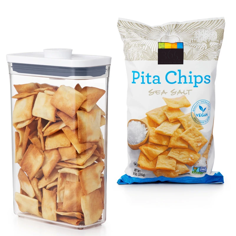 Slim Rectangle Medium Container, 1.8L. The slim design allows it to fit in tight spaces. Gives an airtight seal with the press of a button. Accessories attachment on base of each lid allows to store scoops, levelers and more. Containers are stackable for optimal countertop and pantry organization. Container corners allow for easy pouring. Pop-up button serves as handle to lift off lid.