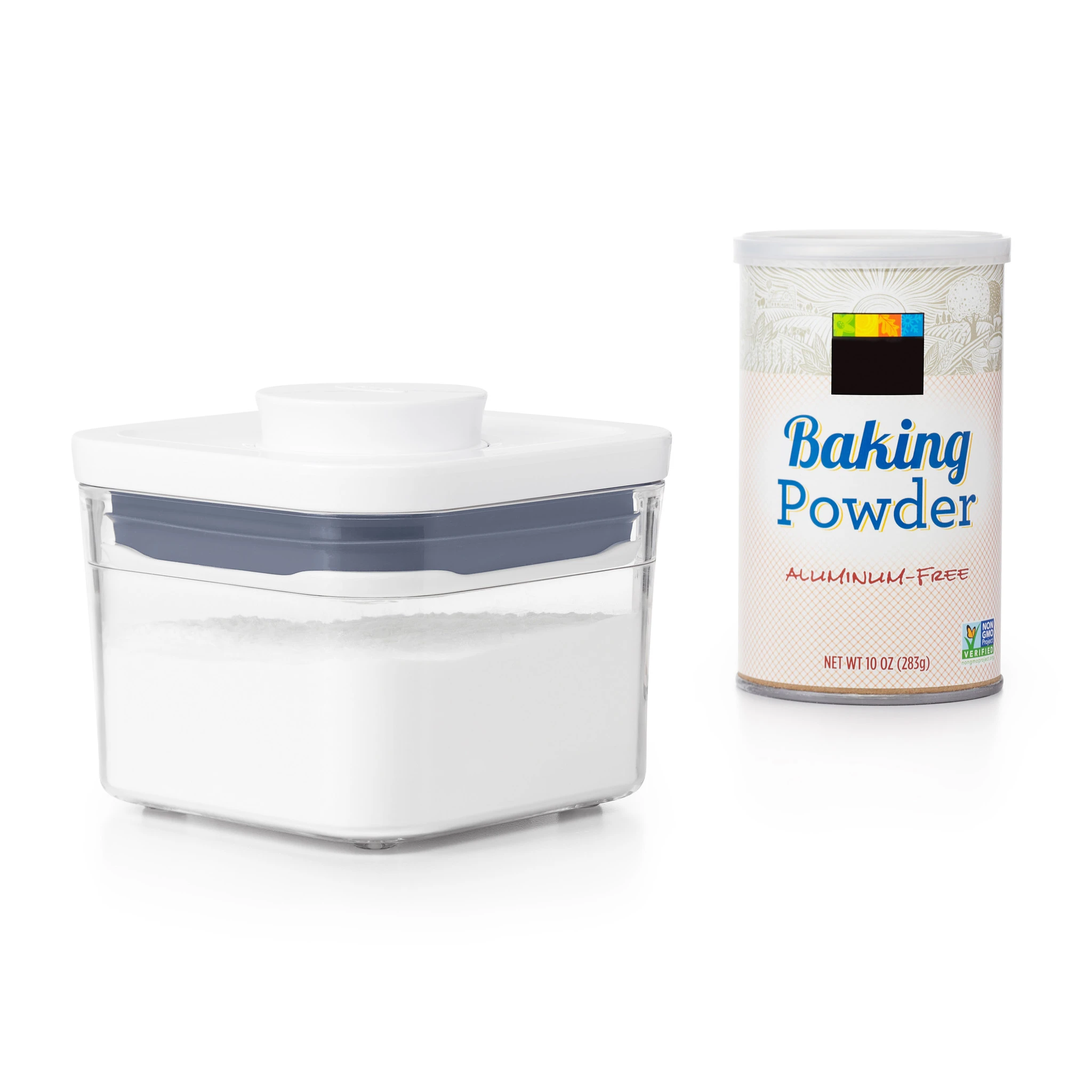 - Container corners allow for easy pouring. Pop-up button serves as handle to lift off lid.