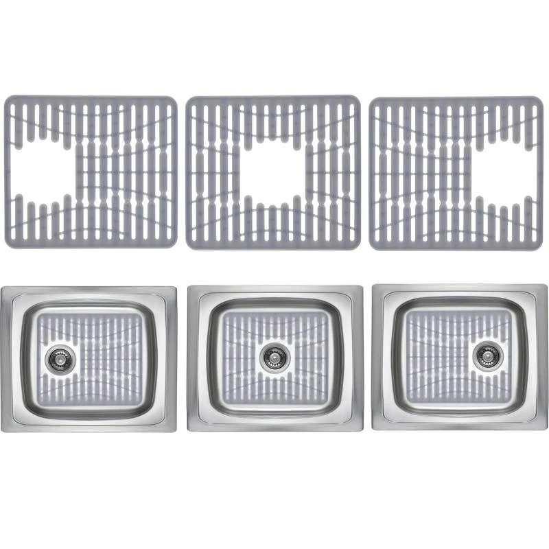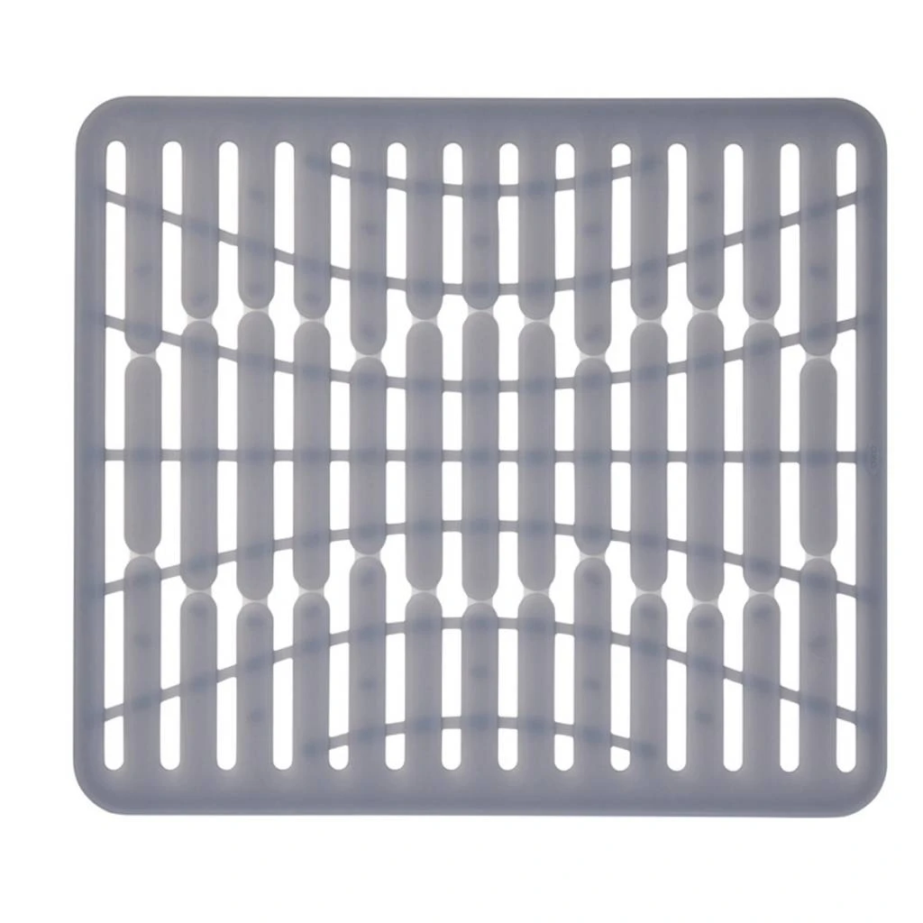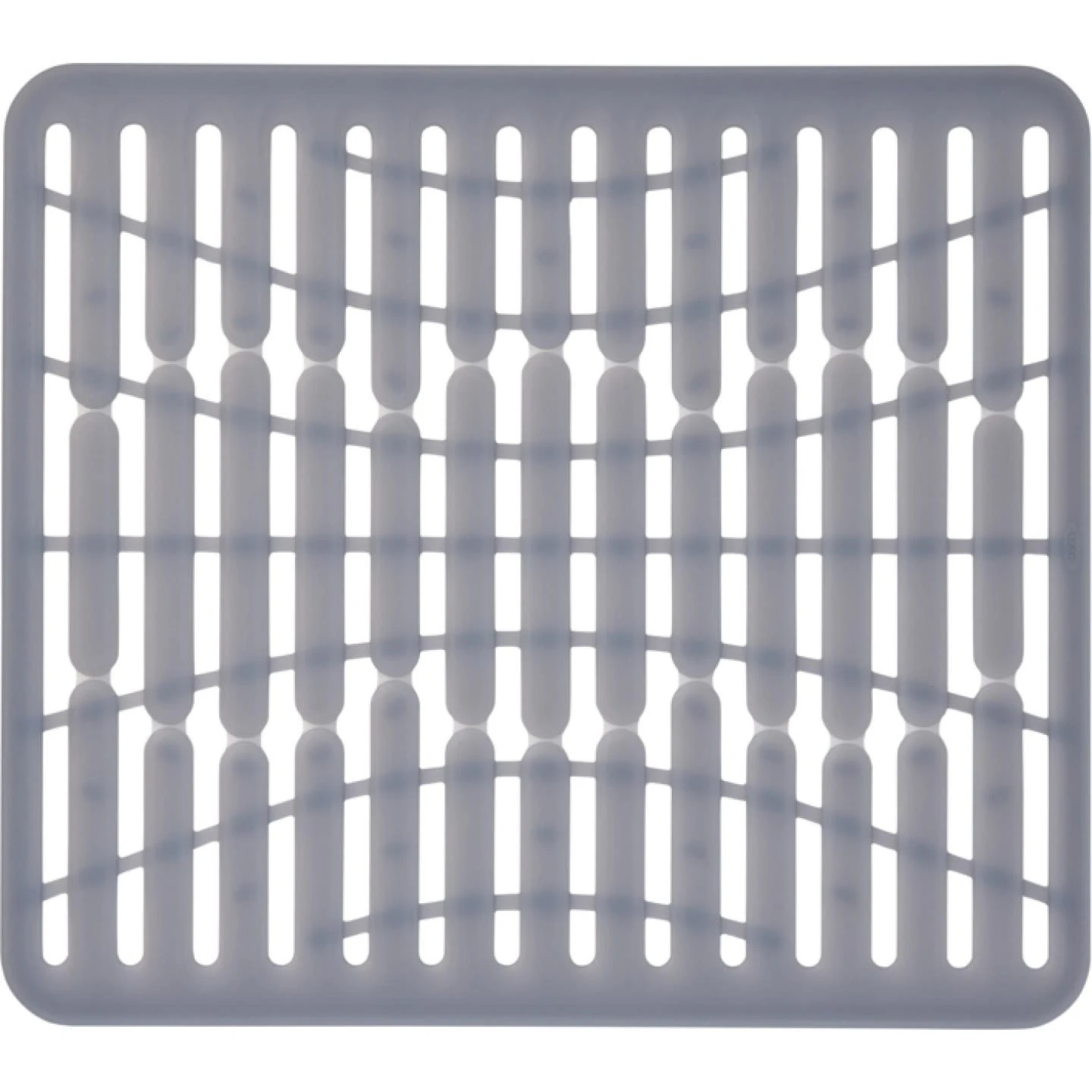 Sink Mat, small, 11.25 X 12.75″ / 28.5 x 32cm, grey, silicone, PVC free. The soft silicone provides a cushion to protect sink, glasses and dishes from scratching and chipping. Elevated underneath to allow for water flow and aeration. Designed with a convenient pattern that allows you to cu t a hole exactly where you need it, whether your sink drain is in the center or offset . The silicone is heat-safe, making it safe to place pots and pans in the sink directl y from the stove. Dishwasher safe.
