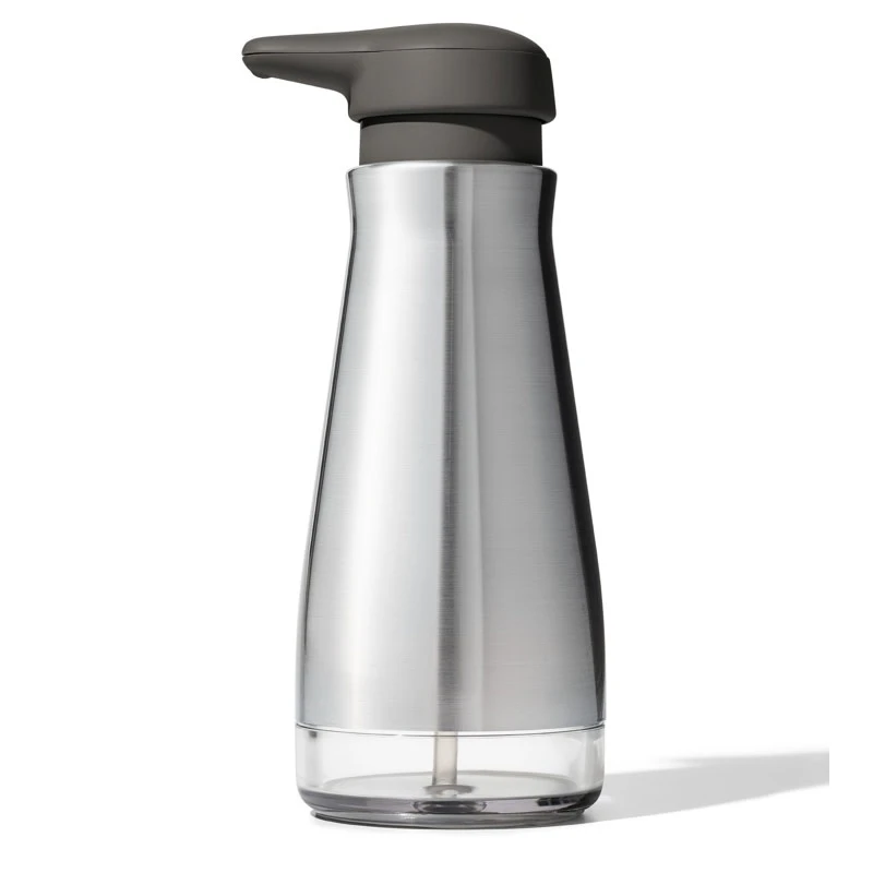 Stainless steel with fingerprint-proof finish. Features a soft, non-slip button for easy dispensing. The top has a large opening for no-mess refilling.
