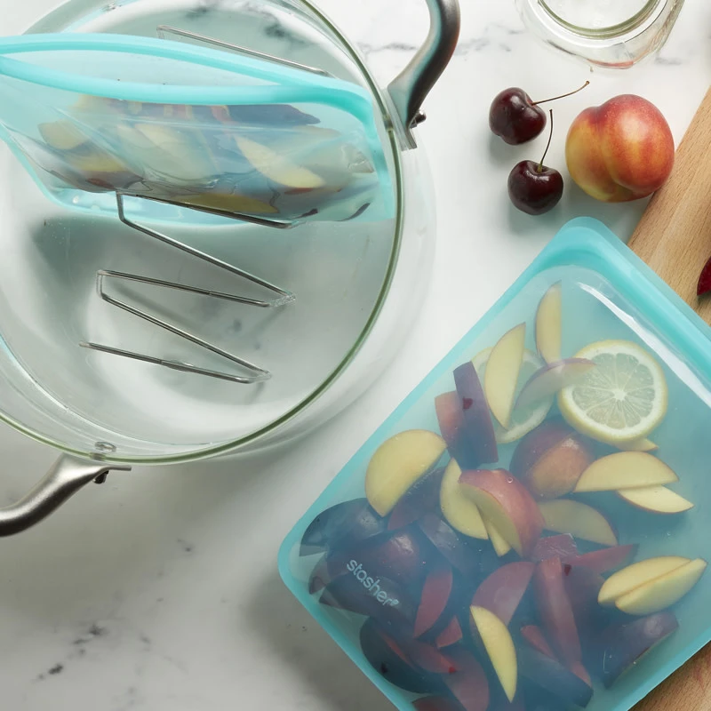 Half-Gallon Sous Vide Bag64oz / 1.92L, 100% pure platinum silicone, BPA, BPS and plastic free. Sized for boiling and sous vide cooking, STASHER is the revolutionary alternative to plastic bags and containers. The innovative pinch press™ airtight seal lock
